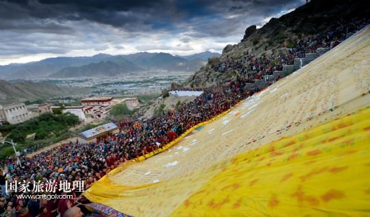國家旅游地理 西藏拉薩8月6日訊 8月6日,拉薩哲蚌寺舉行展佛儀式。當(dāng)日,以西藏最大的格魯派寺廟哲蚌寺展佛為開端的雪頓節(jié)在拉薩拉開序幕。每年藏歷六月底七月初是西藏傳統(tǒng)的節(jié)日“雪頓節(jié)”。在藏語中,“雪”是酸奶子的意思,“頓”是“吃”“宴”的意思,“雪頓節(jié)”按藏語解釋就是吃酸奶子的節(jié)日,因此又叫“酸奶節(jié)”。因?yàn)?ldquo;雪頓節(jié)”期間有隆重?zé)崃业牟貞蜓莩龊鸵?guī)模盛大的曬佛儀式,所以有人也稱之為“藏戲節(jié)”“曬佛節(jié)”。 /新華社記者 普布扎西攝