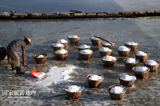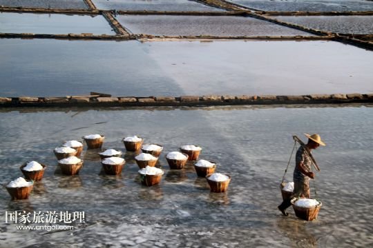 國(guó)家旅游地理 浙江臺(tái)州8月10日訊 8月10日,在浙江溫嶺市石塘鎮(zhèn)蒼岙鹽場(chǎng),一名鹽工頂著太陽(yáng)在鹽田里把曬好的鹽收集起來(lái)挑到鹽堆去。連日來(lái),浙江省溫嶺市石塘鎮(zhèn)蒼岙鹽場(chǎng)的鹽工利用晴熱天氣忙著曬鹽。對(duì)于浙江的曬鹽人來(lái)說(shuō),夏季陽(yáng)光最猛烈的7月、8月、9月這三個(gè)月是他們勞作的黃金季節(jié)。天氣越炎熱,光照越猛烈,曬鹽效果就越好。炎熱的夏天艷陽(yáng)高照,而曬鹽人卻要頂著高溫出門(mén)勞作。 /新華社發(fā)(梁敏慧 攝)