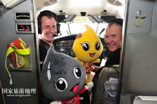 8月14日,百年靈噴氣機(jī)隊(duì)保障機(jī)飛行員呂克(左)和飛行隊(duì)負(fù)責(zé)人奈杰爾(右)在飛近克拉瑪依時(shí),揮舞克拉瑪依航空旅游節(jié)吉祥物“克拉”和“瑪依”以示慶祝。