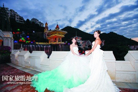 乘著電瓶車,從客天下廣場穿過雅致的圣山湖住宅區(qū),赫然出現(xiàn)在眼前的卻是大型婚禮殿堂,純歐式的建筑群隱匿在青山綠水中:乳白色的圓形屋頂、七彩斑斕的玻璃窗、富麗堂皇的大吊燈,見證了一對(duì)又一對(duì)新人走進(jìn)幸福的殿堂。在充滿異域風(fēng)情的幸福里大街,蘇格蘭風(fēng)笛表演、皇家馬車、中世紀(jì)格調(diào)的咖啡館,一幕又一幕,讓人恍若時(shí)空交錯(cuò)。