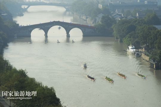 國(guó)家旅游地理 浙江杭州11月9日訊 11月9日,參加500米直道競(jìng)速賽的龍舟隊(duì)從運(yùn)河拱宸橋畔出發(fā)。當(dāng)日,2013年中國(guó)龍舟公開(kāi)賽年度總決賽(杭州站)在京杭大運(yùn)河杭州拱宸橋段舉行。 /新華社發(fā)(李忠 攝)