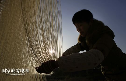 據(jù)了解,秦家圈村有冬季制作手工拉面迎新年的傳統(tǒng)。村民經(jīng)和面、發(fā)酵、盤條、拉面、晾曬等多道工序,手工制作成細(xì)潤(rùn)綿長(zhǎng)、風(fēng)味獨(dú)特的面條。制面期間,潔白的線面宛若銀絲在風(fēng)中飄蕩,成為鄱陽(yáng)湖畔一道別致的鄉(xiāng)村景觀。 /新華社發(fā)(傅建斌 攝)
