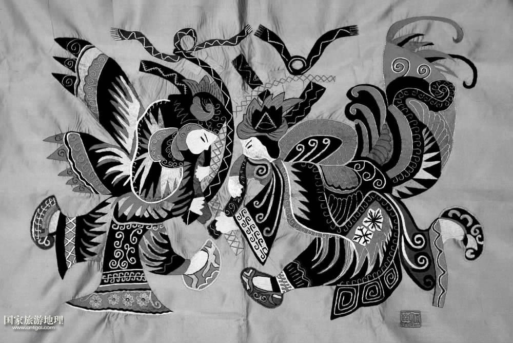 苗繡是指苗族民間傳承的刺繡技藝,主要流傳在貴州省黔東南苗族聚集區(qū)。苗繡工藝有其獨(dú)特性,如雙針鎖繡、縐繡、辮繡、破紗繡、絲絮貼繡、錫繡等。刺繡的圖案在形制和造型方面,大量運(yùn)用各種變形和夸張手法,表現(xiàn)苗族創(chuàng)世神話和傳說(shuō),從而形成苗繡獨(dú)有的藝術(shù)風(fēng)格和刺繡特色。/邵陽(yáng)晚報(bào)