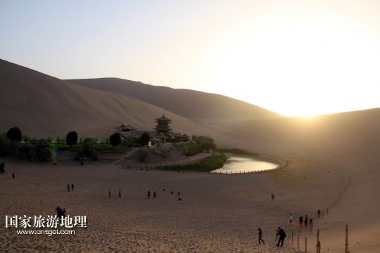國家旅游地理 甘肅酒泉5月19日訊 夕陽下的甘肅省敦煌市鳴沙山月牙泉顯得更加迷人(5月18日攝)。初夏時節(jié),甘肅省敦煌市鳴沙山月牙泉景區(qū)風(fēng)光秀美,吸引眾多中外游客前來觀光游覽。 新華社發(fā)(張曉亮 攝)