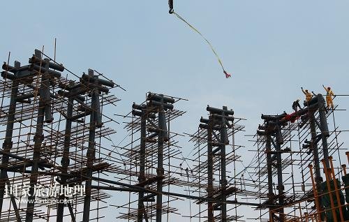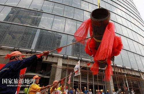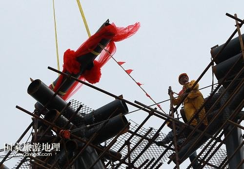 國家旅游地理 上海8月3日訊 8月3日,上海機械施工集團(tuán)公司的工程人員指揮最后一榀桁架的吊裝。當(dāng)日上午,隨著塔冠結(jié)構(gòu)中最后一榀鰭狀桁架緩緩起吊并安裝到位,歷時近6年建設(shè)的“上海中心”按計劃順利達(dá)到設(shè)計高度632米,刷新了“申城之巔”的新紀(jì)錄。據(jù)介紹,“上海中心”2014年年底將實現(xiàn)除酒店精裝修部分外的土建竣工,2015年年中將投入運營。新華社記者 裴鑫 攝