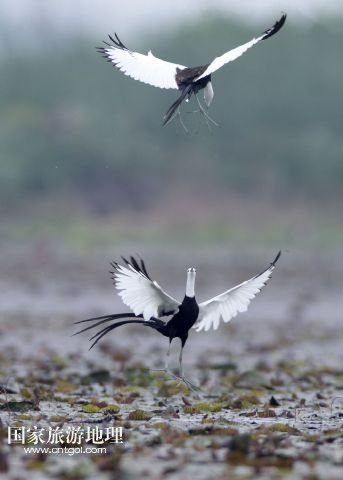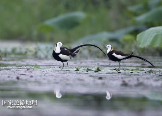 國(guó)家旅游地理 江西九江5月31日訊 5月29日,兩只水雉在江西省九江市賽城湖濕地嬉戲。入夏以來(lái),數(shù)十只漂亮的水雉飛抵江西九江市賽城湖濕地,湖區(qū)良好的生態(tài)為水雉提供了舒適的棲息環(huán)境。水雉體態(tài)優(yōu)美,羽色艷麗,輕步行走于睡蓮、荷葉等浮葉植物上,有“凌波仙子”的美名。/新華社發(fā)(沈俊峰 攝)