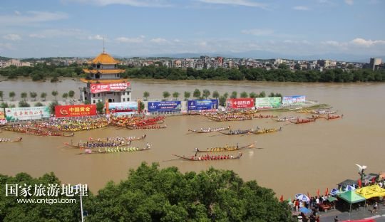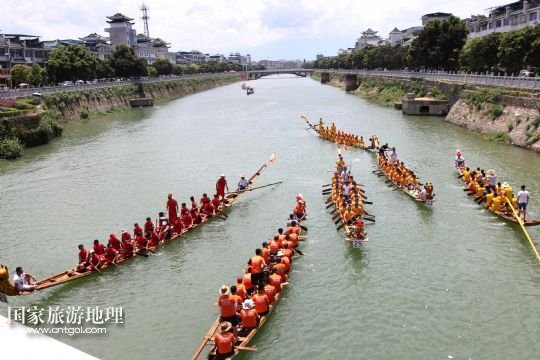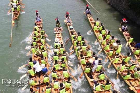 國(guó)家旅游地理 湖南永州6月16日訊 6月16日,參加道縣龍船賽的龍船在水面上角逐。