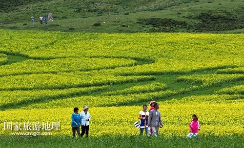 7月14日,游客在甘肅民樂油菜花海游覽。