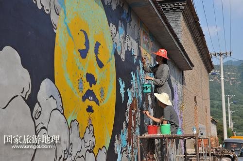 8月10日,兩名藝術家在山西省和順縣許村的墻壁上繪畫創(chuàng)作。近年來,許村發(fā)展旅游業(yè),三次舉辦鄉(xiāng)村藝術節(jié)并邀請國內(nèi)外藝術家參加創(chuàng)作,讓現(xiàn)代藝術和鄉(xiāng)村文明相互融合。