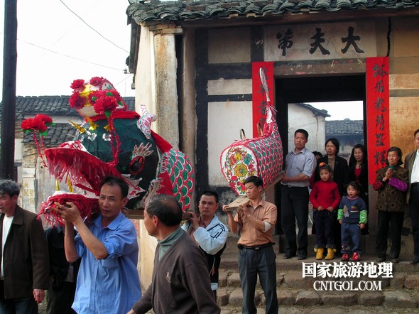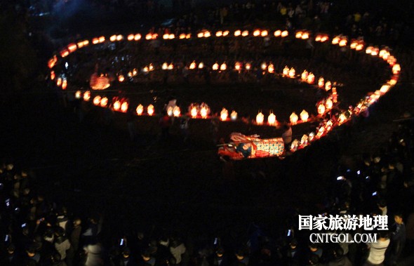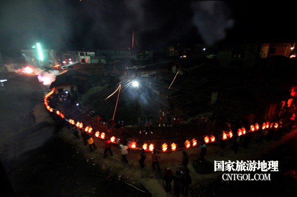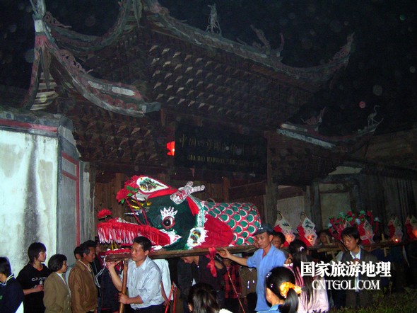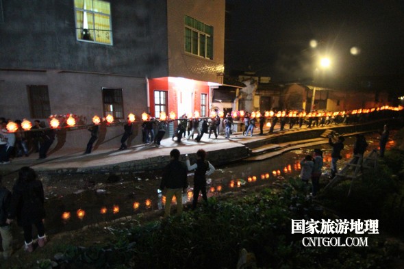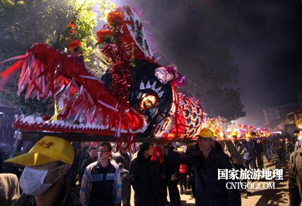 2月18日入夜,春雨霏霏。在光裕堂祖祠祭龍頭畢,鄒姓村民紛紛肩抬慶燈到祖祠接成220多米長的“龍”身。三聲銃響,游龍時(shí)而在村間慢悠游弋,時(shí)而在村道滯拔狂走,火紅的燭光伴著霏霏春雨,讓慶燈“龍”絢麗多姿,展示了“紙包火”的奇跡。 游“龍”所經(jīng)之處,鞭炮和禮花聲不絕于耳,祈求五谷豐登、吉祥如意。街巷人山人海,熱鬧非凡,一派花燈游龍慶豐收狂歡鬧元宵盛況。 吸引了海內(nèi)外游客及四鄰八鄉(xiāng)的萬余群眾紛紛前往觀看。