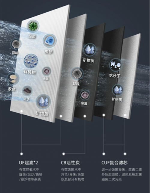 除去主濾芯,另外兩個副濾芯分別是CB活性炭濾芯和CUF活性炭超濾膜復合濾芯。其中,CB活性炭濾芯吸附水中余氯、異色異味、有機物,改善飲水口感,讓自來水變得更加甘甜鮮活,口感甚佳;而CUF活性炭超濾膜復合濾芯則能進一步吸附水中的余氯等異色異味,提升飲水口感,并防止碳粉泄露和微生物侵入,避免水質二次污染。